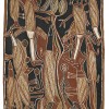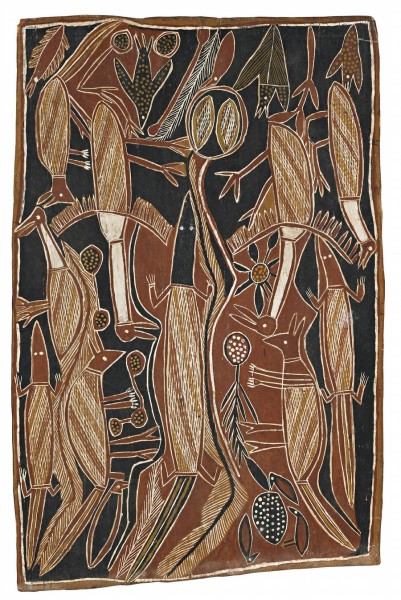 handwritten label attached verso: Artist: John Munturrug Munturrug (sic) / Tribe: Burera / 172 / The dogs have come into / the country of the water goanna / and pied oyster catcher and / the butterfly. Johnny is a singer / and he sings these songs