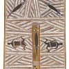 The Wagilag Sisters story, also known as Wagilak or Wawilak, has wide significance for people of the Dhuwa moiety of central and eastern Arnhem Land. This large scale bark depicts the Wagilag Sisters on either side of a hollow log with two goannas and two birds – these were among the animals the Djang'kawu saw when they first arrived at Yalangbara. In the top section are four more goannas gathered around a waterhole, a classic Rirratjingu motif often used by the artist.