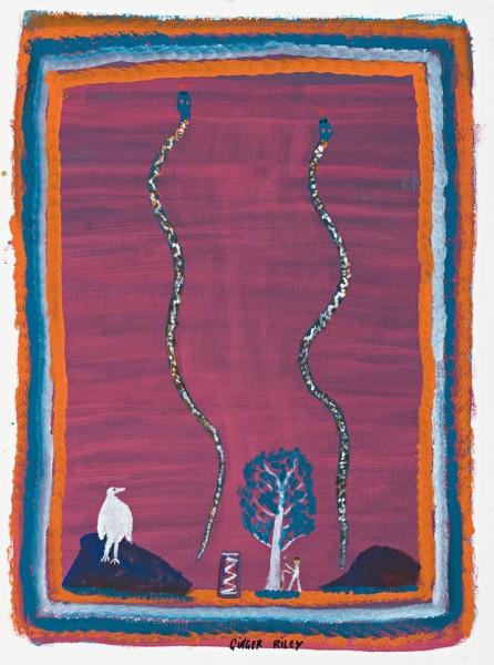 The original certificate from Alcaston Gallery states in part: 'The white breasted sea eagle, Ngak Ngak is often shown singly or as a repeated image; he acts as a sentinel looking around Munduwalawalas mothers country. Garimala, depicted as two travelling creator snakes, travel the land around the Four Archers. The Limmen Bight River, the artists homeland Wamungu and Maria island lagoon surrounded by bark shelters occupied by the artists ancestors are all part of the artists iconography.'