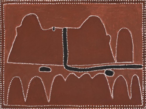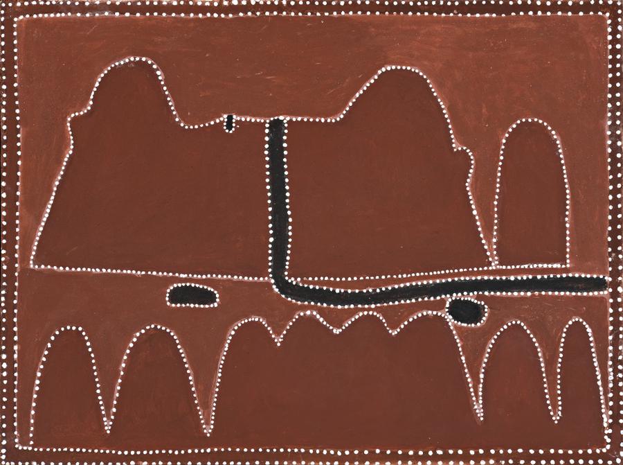 The paintings of Queenie McKenzie and her close friend Rover Thomas possess a unique style which has given East Kimberley painting its distinctive character. The dotted delineations on vast backgrounds of natural ochre may be understood as symbols and maps that denote important aspects of their country. However, the disclosure of meaning in Aboriginal art is often conditional; stories and sites of significance depicted in tribal land are revealed in ways which are specific to particular Aboriginal groups. Accordingly, the simple elegance in paintings such as My Propa Home (Texas Downs) belies often complex and specific meaning. For example, the large hill is a bush tucker place called 'Budawa'; two black ovals are kangaroos with broken bones that have fallen from the hill; and the rise and fall of the single dotted line in what we might imagine as the foreground signifies the spirit teacher's direction for people to stop walking – to go their own way, or they'll be turned to stone.1
