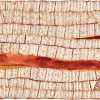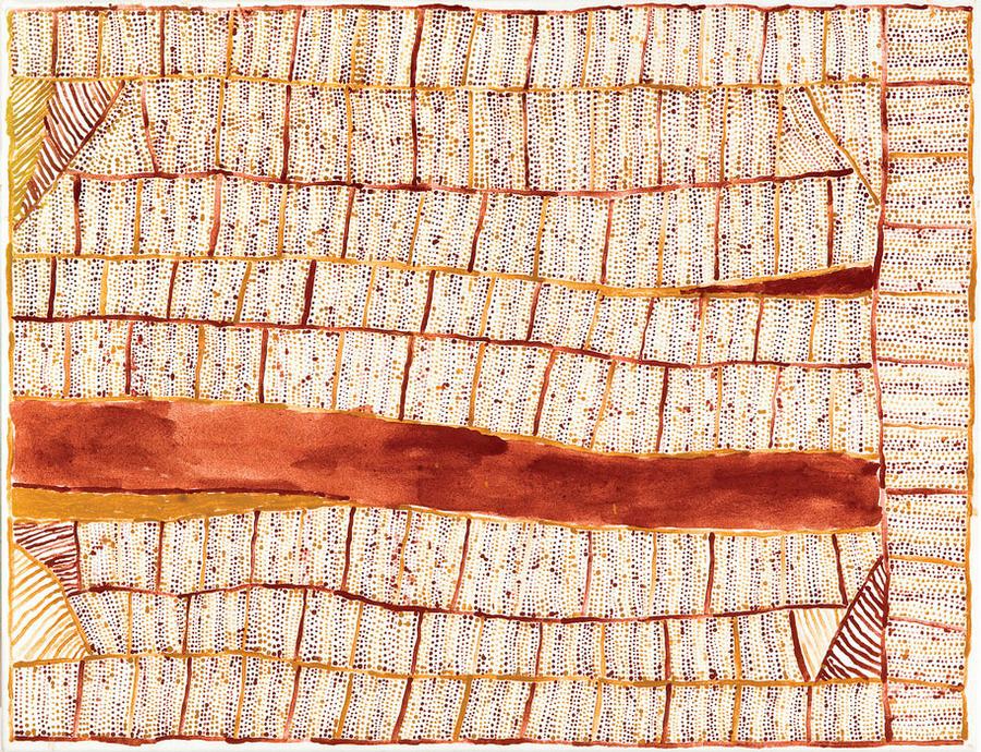 Characterised by a mixture of lines and dots, the abstract designs of Tiwi artdepict the ornate body painting that has been used for centuries as part of the Pukamani (mortuary) ceremonies. The works of Kutuwulumi Purawarrumpatu (Kitty Kantilla), for many years the senior and most renowned painter from Milikapiti, exemplified this enduring art movement. Her art is typified by amixture of intricate lines of dots, bold areas of solid pigment and areas of delicate line work. Pumpini Jilamara 2002 is a classic example by the artistwith the design defined by the overall grid, solid bands of ochre with eacharea in-filled with fine lines and dotting.
