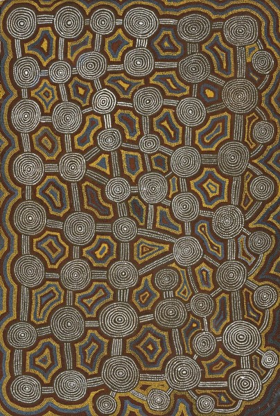 This painting is accompanied by a certificate of authenticity from Papunya Tula Artists, which states: ‘The secret-sacred Tingari site of Wapatjarra to the south-west of Lake MacDonald is depicted in this painting. In mythological times a large group of Tingari Men made camp at this site. As the mythologies associated with this site form part of the Tingari Cycle, no further information was given. Generally, the Tingari are a group of mythical characters of the Dreaming, who travelled over vast stretches of the country, performing rituals and creating and shaping particular sites. The Tingari men were usually followed by Tingari women and accompanied by novices and their travels are enshrined in a number of song cycles. These mythologies form part of the teachings of the post-initiate youths today as well as providing explanations for contemporary customs.’