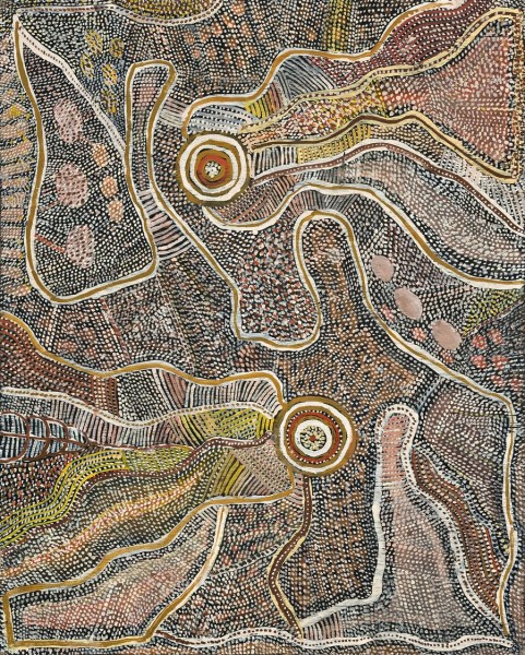 This painting on board was most likely executed around 1972/73 at a time when the artist was producing a series of exquisite paintings based on the Water Dreaming theme. Containing all the elements of what Geoffrey Bardon referred to as the 'calligraphic motifs' connected with the Water Dreaming, this painting incorporates rain, lightning, waterholes, cliffs and bush tucker. Utilising a technique of overlaying layers of fine dots, Warangkula established an analogy between broken patterns of dotting and vegetation and topography. As curator Judith Ryan notes, Warangkula was the first to devise a style that existed on an aesthetic plane... by colour mixing and layering of dots laden with white, he obscured symbols of narrative or signs of secret men's business in ways that prefigure the dot field paintings of Emily Kngwarreye'.1
