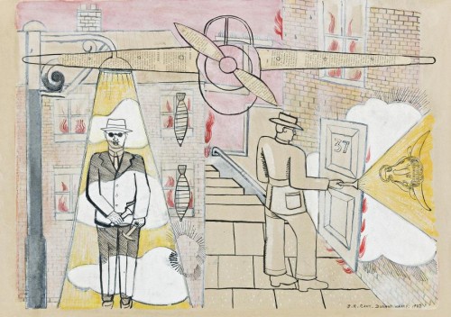 watercolour, body colour, newsprint collage, pen and ink on paper