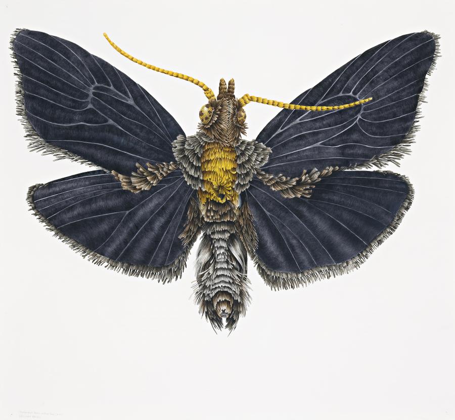 Interestingly, the artist's preoccupation with natural history illustration arose initially from the simple desire to record the remains of a dead butterfly, plucked from the grille of a car by a friend.1 Indeed, this poignant episode not only provided the impetus for her large and complex watercolour Red (Colony) 1999-2000, awarded the Mornington Peninsula Regional Gallery's prestigious 'National Works on Paper Prize' in 2001, but inspired sp. 2001, a series of 54 watercolour studies of tiny, unclassified moths that the artist produced during a residency at the CSIRO Entomology Division's Australian National Insect Collection. Notably, the latter also complemented her work on the group portrait of rock band Midnight Oil, commissioned the same year by the National Portrait Gallery, Canberra, in which de Medici transferred patterns from the moth's wings onto each member's neck to symbolise their roles as spokespersons for the environment.2