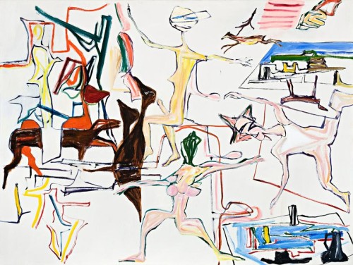 signed, dated and inscribed verso: Ken Whisson /“Open Air Circus with / Germanic Hermaphrodite /and Brown Ducks” / painted: 26/10/83 /& 6/2/84 & 23/12/87