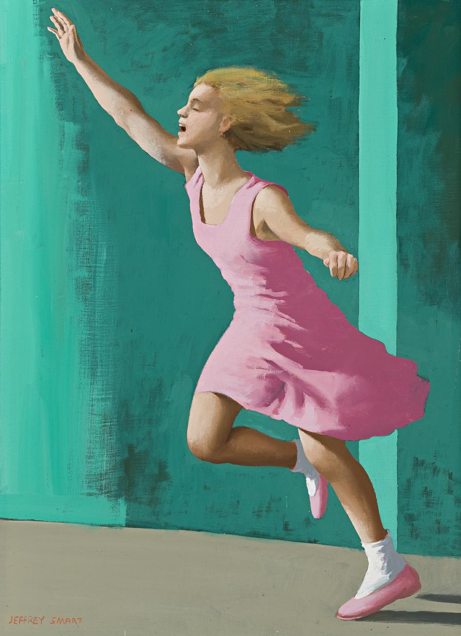 In his pursuit of compositional perfection, Smart often paints several smaller studies, of which this is a typically fine example. Although they lead to a larger, more detailed painting, they are in themselves complete works. Not only are they quite individual, they are also quite different in the prominence given to motifs, such as figures, which play lesser roles on the bigger canvases. In this study for The Construction Fence the chief interest is the running girl, free and vital in her movements, highlighted in bright pink against the contrasting green. She has been identified as filmmaker Bruce Beresford's daughter (presumably Cordelia); and the green fence that which surrounded the Victorian Arts Centre on Melbourne's St Kilda Road during its construction. Ironically, the interrelationship of place and performance is masterfully realised in a theatrical moment - the outstretched arms and shallow depth of field, which could readily pass for the stage.