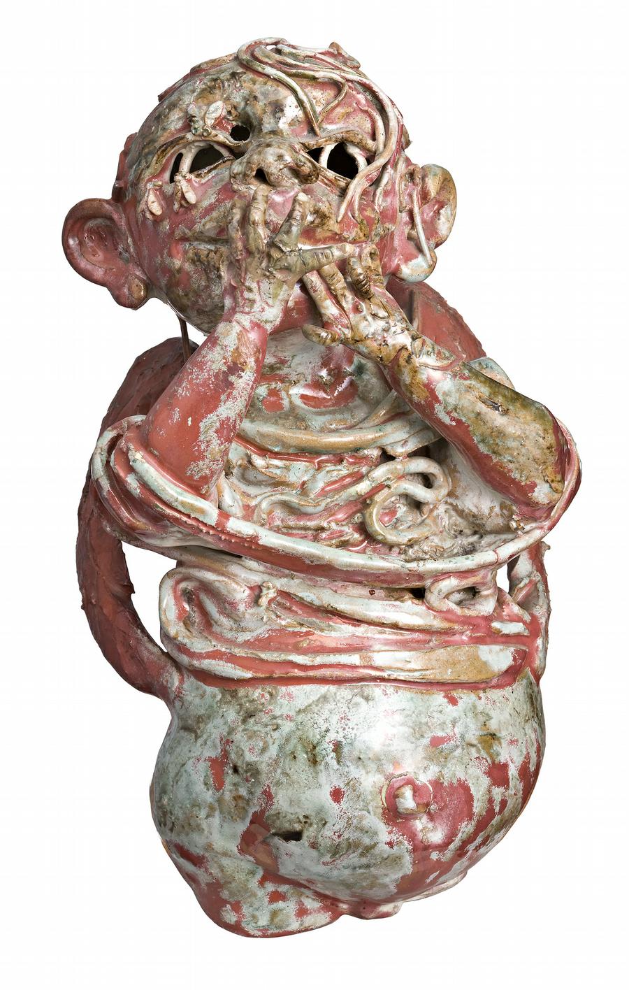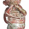 So human and so cheeky, their subjects include angels in ecstasy, clowning, kissing, dancing, fighting, and a special group playing musical instruments - including Angel Playing the Lute in the collection of the University of Melbourne, the celebratory fanfare of Trumpeting Angel, and the Queensland Art Gallery's Angel with a Lute. Bald or of curly or thickly tangled hair, they sing, smile and are often quizzically mischievous. Although of the same style and intent, not all were actually angels - Moses in the Bulrushes, Mother and Child in the collection of the Art Gallery of Western Australia, and Romulus and Remus with Wolf Mother being a few examples. Dwarf and Cripple adopted a more social realist role, yet was so beautiful of form with bright red and green glazes, it took its special place in the Washington Chancellery in the USA. These same glazes are found in the present Angel, the rich red sang-de-boeuf glaze contrasted with an almost celadon green. Intimacy of size, as in this work, also adds to their appeal, as does the lively wit and sparkling play of light across lustrous surfaces. Wheel thrown and built by hand, they have a rococo delight in gaiety and intricacy of line and form. Inspiration came from several sources. Foremost were earlier paintings of his own children, and the old masters Perceval acknowledged - the early Italian Renaissance sculptors Luca della Robbia and Donatello, and the fifteenth century French master Jean Fouquet's painting Virgin and Child with its crowd of red and blue angels.2 But most of all - the Angels are, in fact, John Perceval telling us about himself: he is his own angel - 'a puckish angel, a mischievous angel, a trouble-making angel, an angel who plays the harp with an angelic leer, a perverse angel, a clown angel.'3