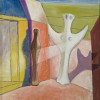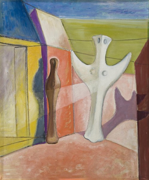 Roy de Maistre's move to London in mid-1930 soon found him associated with the avant-garde, holding a joint exhibition with Frances Bacon that same year. Supported by both of London's leading contemporary galleries, the Mayor and Zwemmer, he rapidly began making a name for himself. The Mayor, which was associated with such major Continental artists as Picasso, Paul Klee and Jean Miro, and the English Edward Wadsworth and Eric Gill, gave him a solo exhibition in 1934. Widely reviewed and well received, the critic for the Scotsman described his paintings as 'thoughtful essays in the Picasso- Chirico tradition, rich in colour and in their arrangement of abstract shapes often vital and exciting.'1 Annunciation, reflecting, as it does, the words of the critic, was one of the paintings in this exhibition. Acquired by the prominent writer and art collector, Dimitrije Mitrinovic, it is not known if he lent Annunciation to the exhibition or purchased it there. An influential friend, Mitrinovic owned a number of works by De Maistre. His circa 1953 portrait by De Maistre is in the collection of the Art Gallery of New South Wales. Interestingly, in 1934 De Maistre also exhibited several works at the Zwemmer Gallery, This was the same year in which the Gallery presented the important exhibition Objective Abstractionists of works by such young British artists as Graham Bell, Ivon Hitchens, Victor Pasmore and Ceri Richards. At some time the Zwemmer Gallery also handled Annunciation. De Maistre considered it to be so important a work that he included it in his 1960 retrospective exhibition held at London's Whitechapel Art Gallery.