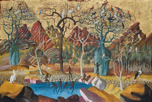 The much larger work, Australian Fantasy (Landscape), 1964, is related thematically in its legendary emphasis and allied use of gold. Ravishingly beautiful in its use of line and colour, and spectacular in its imaginative celebration of Australia and her indigenous peoples, the work provides an image of that golden age so loved by the ancient Greeks. It is the Christian equivalent of the Garden of Eden, bounteous and peaceful. The rainbow of colours associates it with what lies where it touches the earth, the rainbow being a symbol of reconciliation. The plenitude of bird life of exotic plumage, and the joyous gestures of the Aboriginal people echo the harmonious beauty of all life. Painted in the period between Friend's return to Australia from Sri Lanka in 1961 and his departure for Bali five years later, Australian Fantasy constitutes an apotheosis of Aboriginal Dreamtime in harmony with European lore and legend.