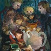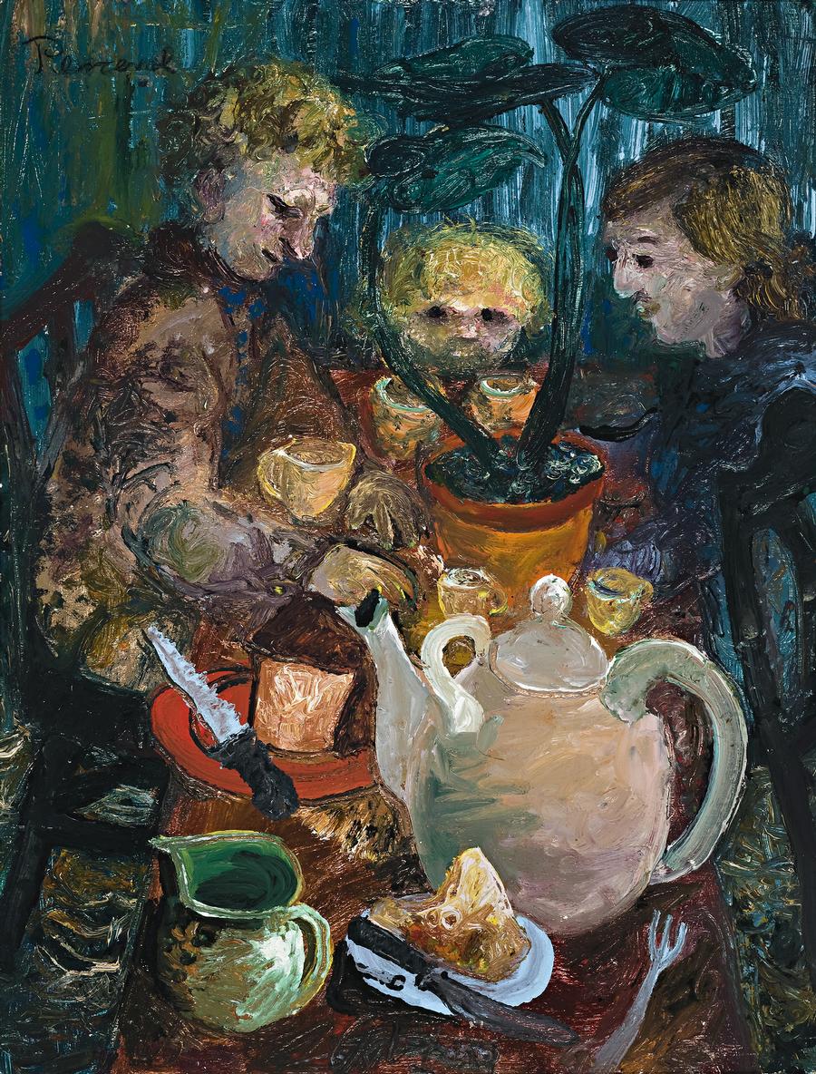 The Family 1959 is an intimate painting, warm and unassuming. Looking at the work, one cannot but be reminded of Perceval's biblical-inspired earlier works; it is like a rustic nativity of comfort and reassurance. It is gentle, lyrical and loving and the pottery in the foreground is possibly his, or that of artist and Murrumbeena pottery decorator, Neil Douglas (1911 - 2003) who is included in the subject. Out of a deep, rich background the figures radiate a charm and innocence: an image of an idealised childhood that the artist himself never had.