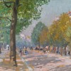 In the spring of 1905, Emanuel Phillips Fox married Ethel Carrick in London, before moving to Paris to live on the Boulevard Arago, Montparnasse. The Luxembourg Gardens were nearby, as also their friends Rupert and Jeanne Bunny, their close friendship having a fruitful influence on each other's art. Paris was the centre of European art and culture. The time was the celebrated la belle Epoque when feminine fashion achieved unparalled heights of elegance especially in the splendour of its marvellous dresses and fabulous hats. To stroll in the gardens or promenade along the leafy boulevards was a particular pleasure for those who led a life of ease. Captured by Fox in the sparkling colours of spring, he used the broad avenue of Parisian Boulevard to invite viewers to enter this gracious world of beauty and leisure, bathed in a dappled sunlight of gentle appeal. Now more Impressionist in style, he found his subjects in the changing times of day, as in Misty Morning on the Seine, c.1906, in the collection of the National Gallery of Australia, Canberra, and especially the Whistlerian inclined Twilight on the Seine, c.1906, in the Art Gallery of New South Wales. Fox's biographer Ruth Zubans noted that 'Paris was a rich source of inspiration for Fox. Continued interest in colour and light brought him into a more thoroughgoing dialogue with French Impressionist art, particularly the 1860s and 70s works of Renoir and Monet, by then widely accessible.'1