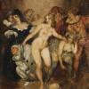 Characters of the theatre often found their way onto Norman Lindsay's canvasses, Pierrot and Harlequin being two of his favourites. This is not surprising for they had long attracted European painters. Jean- Antoine Watteau's Pierrot, c.1718-19, is in the Louvre, and both figures sport frequently in the art of Pablo Picasso, reflecting their even greater popularity in Italian and French theatre. Pierrot, the buffoon figure of mime and the Commedia dell'Arte, was traditionally dressed in a loose white costume with large buttons as fitting the character of the sad clown. He was hopelessly in love with Columbine. When she leaves him for Harlequin, another stock character of the Commedia Dell'Arte, she breaks his heart. Harlequin, the acrobatic trickster, in contrast is distinguished by his colourful, diamond-patterned costume. Both appear to left and right of Lindsay's central image of feminine beauty and desire. Other exotic costuming, lighting and frolicking good fun suggest a moment of theatre. Even the pale and melancholic Pierrot, so often the butt of others pranks, is involved through physical support and presentation by gesture of the main character - a Venus love goddess of Lindsay's invention and admiration. At her feet there lies a large egg, long a symbol for arcane beliefs to do with creation, spring and fertility. In Christianity it is the symbol of the Resurrection. Perhaps the artist had another kind of freedom in mind?