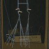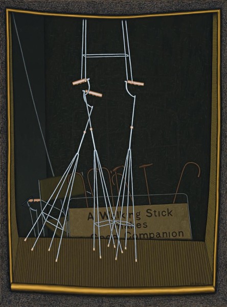 As Helen Brack elucidates, 'In Promenade, the gold frame of the window, hanging from the top corners of the picture rectangle, is on top of the picture plane - the rectangle thus containing the space behind the window frame. We look frontally at the walking frames, but down at the floor of the window box, and then refocus to look frontally at the written notice - 'A walking stick makes a good companion'. Behind this, further into the back of the window, are the brown wooden walking sticks leaving the chair - the one leading off the right side of the picture being larger, its curve almost a shepherd's crook. Into the picture space just behind this walking line, is a cold slanting line directing out of the tableau into the nether regions of the left extreme corner of the window, pointing to the corner of the picture, itself. This line is cold and metallic as are the walking frames taking their promenade. The cold dark space of the window goes beyond the back plane of the picture, into a dark area with superimposed grey flicks, a dense nothing, within which are ghostly shapes of wheelchairs echoing the shapes in the front window. This harks back to the ghostly figures in The Slicing Machine Shop, 1955. The middle tone aerated space outside the window is flicked with dark and belongs to the picture rectangle itself; it is not the same space as the window's dense nothing, indeed it is the opposite. This space is, perhaps, the time space of the living, of us, the viewers. It is interesting, that John has given the color of flesh to the handles of the walking frames, and the feet, and reconfigured the three frames into backwards and forwards; two heads together, one leading; two sets of feet together, one trailing; to every possible combination of the three...2