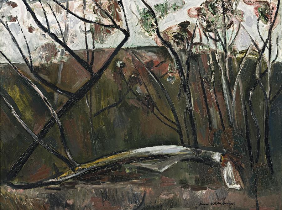 When Fred Williams returned to Australia in late 1956, his friend John Brack asked him what he was going to do. 'Williams: I am going to paint the gum tree. Brack: You can't do that. Everybody's done that. Williams: Well it's just what I'm going to do.'1 After many years working as a figurative painter in England, he was seeing the Australian landscape through fresh eyes. From the outset his landscapes were distinguished by that unique individuality found throughout his oeuvre. More traditionally pictorial than his minimalist paintings of the 1960s, their appeal lies as much in their imagery and colour as in the very handling of the paint itself. Trees, c.1958-59, like its contemporaries, is so evocative that we tend, as with his later paintings, to see the landscape very much through Williams' eyes. Attuning his style to the new scene, Williams initially retained the sky and horizon line, as in Landscape with Steep Road, 1958, in the collection of the National Gallery of Australia, Canberra, with an emphasis on the flatness of the pictorial surface. The road, as it were, climbs up the picture rather than creating an illusion of depth. This same flatness is a characteristic of Nattai River, 1957-58, in the National Gallery of Victoria, the first work by Williams to be acquired by a public gallery. As in Trees, c.1958-59, Williams worked within a shallow pictorial space, the motifs of gums almost pressed up against the painting's surface giving an intimate view of the trees and dense scrub. Always a classicist, verticals and horizontals are kept in balance, the horizontal curve of the fallen gum acting as a counter weight to the screen of upright trunks. The prominence given to the horizontal foreground motif is a characteristic of his paintings at this time, as seen in the line of the creek in the splendid Black Creek, 1958, and the two versions of Landscape with Rocks of the late 1950s. As often in his art, Williams returned to the motif of the fallen gum before a screen of trees in Scrub at Lilydale, 1958-59. In our painting the focus of attention on the fallen trunk is heightened by its pleasing curve, echoed in the other trees. Soon dispensed with for more rigid, denser imagery, Williams' stylistic development also parted with the skyline, as in Sherbrooke Forrest, 1959, in the collection of University College, Melbourne. Trees, c.1958-59, is an important work in the appreciation of this development. Moreover, in addition to showing Williams' early response to the Australian landscape, it has considerable aesthetic appeal in its pleasing articulation of forms and tactile painterliness.