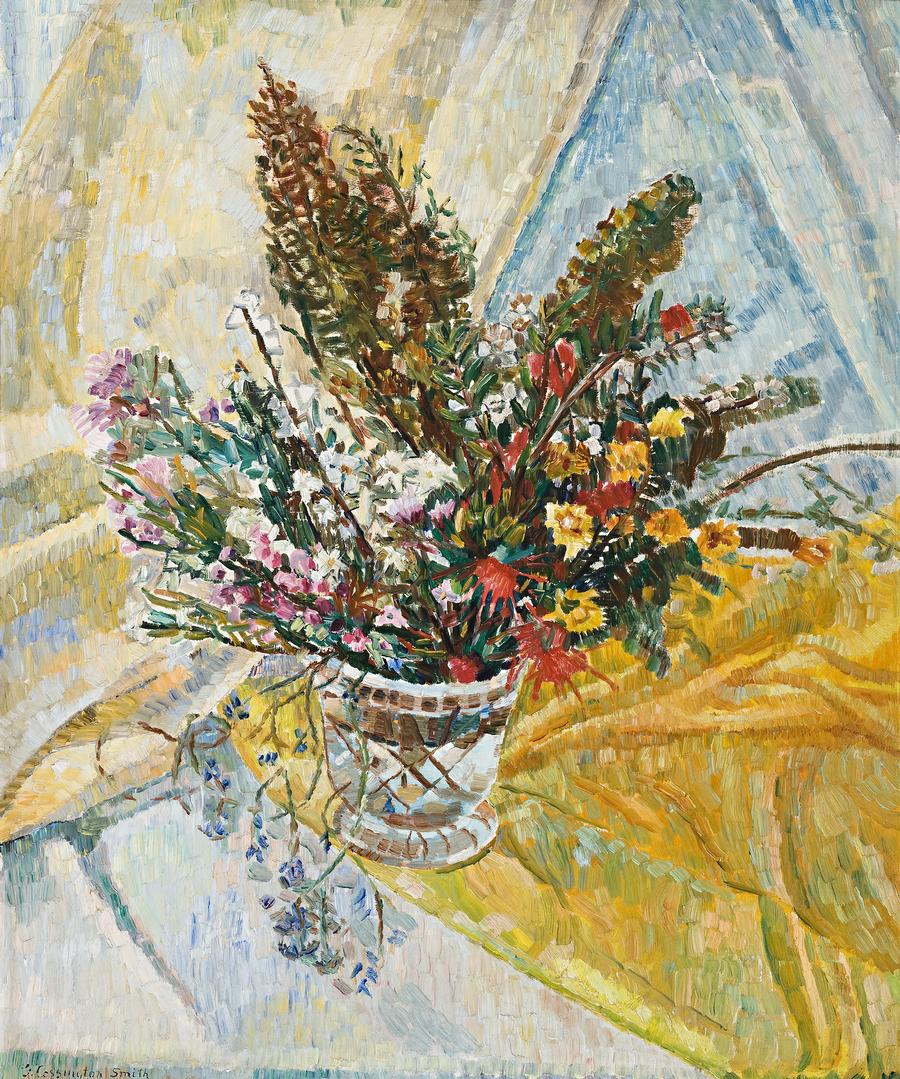 Many of the European flowers in Cossington Smith's still life paintings, such as in Camellia in Jug, c.1926, came from her garden, others were painted in the garden, as in Christmas Lilies Growing, c1927-28, in the collection of the Tasmanian Museum and Art Gallery, Hobart. Spring wildflowers grew further a field, in the nearby bush or were gathered from Lovers Leap gully, as in the distinguished Wildflowers in Jug 1936, presented to the Art Gallery of New South Wales in 1940 by a group of twenty admirers of the artist's work. The choice is significant for the painting is similar to our painting, Wildflowers in a Glass, c.1943, and another fine still life, Blossom with Jug, c.1944-45, once in the collection of Mervyn Horton, first editor of Art and Australia. All share an interest in native flowers and a directness of presentation. Although described as 'still' life paintings, they are anything but that. Flowers set in their vase or jug are placed within a seemingly simple field of drapery of various colours - yet all is bursting with life. The vitality of the brush strokes and the radiance of the colours continue through the swirling movement of the drapery, the actual motif being the centrepiece of this intense activity. Yet, there is an inner serenity, a still moment of meditative perception achieved through the dazzling light captured in the mosaic-like touches of colour. Wildflowers in a Glass was shown with the Contemporary Group, Sydney in 1944, and included in Cossington Smith's grand retrospective exhibition arranged by the Art Gallery of New South Wales in 1973.