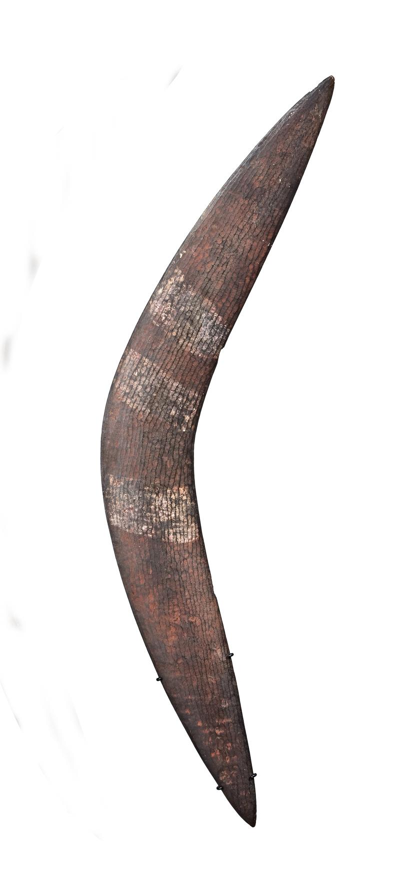 of plano-convex section, the surface replete with fine stone cut adzed markings and decorated with broad bands of red and white natural pigments