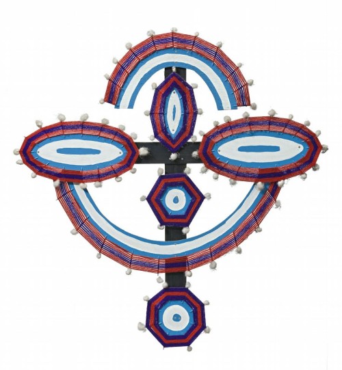 synthetic polymer paint on hardwood, with natural and commercially-dyed wool