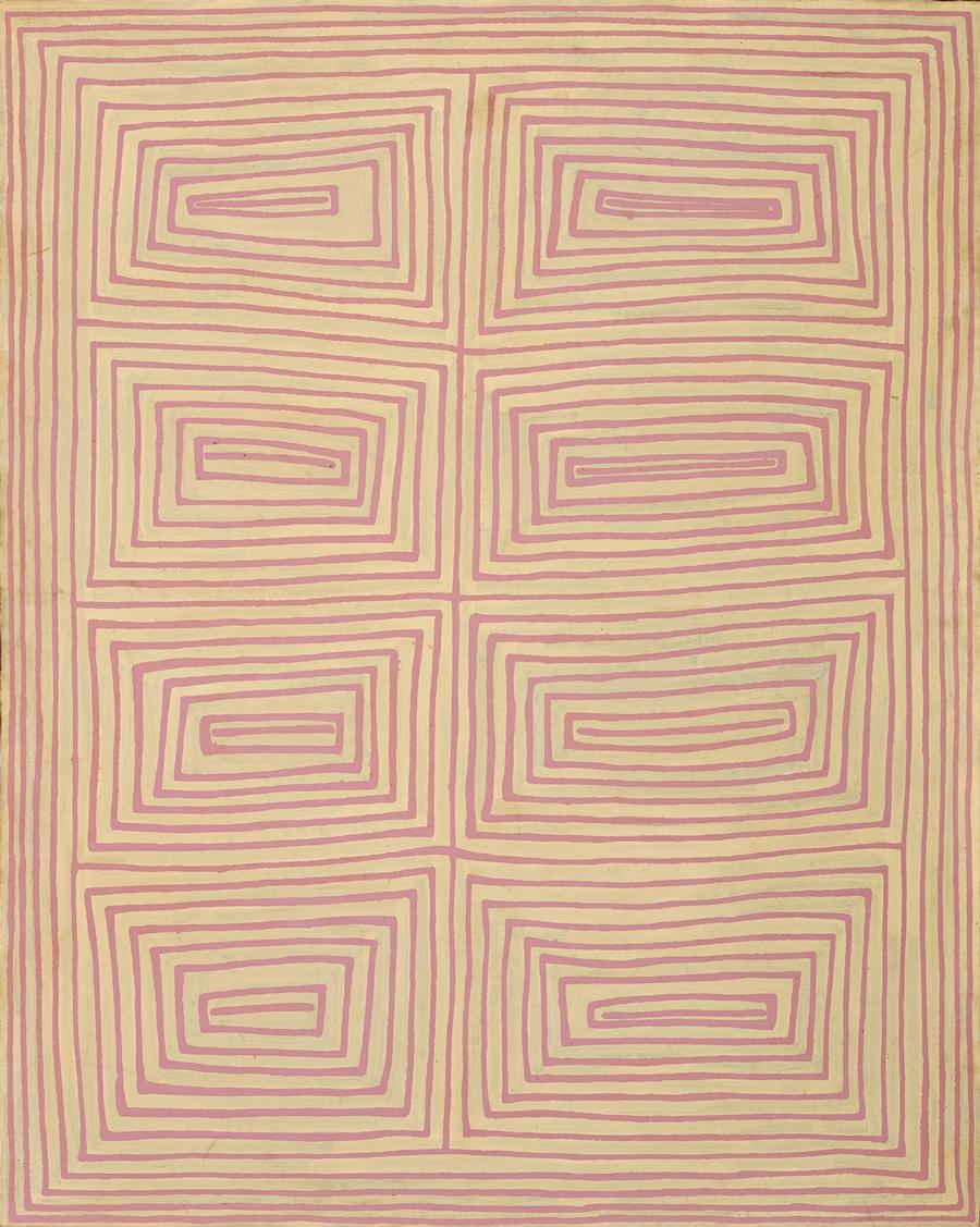 This painting is accompanied by a certificate of authenticity from Papunya Tula Artists, Alice Springs, which reads in part: 'This painting depicts body paint designs associated with Tingari ceremonies at the large rockhole site of Kirritijina, north of Jupiter Well. In mythological times a large group of Tingari Men camped at this site before travelling east to Lake Mackay.'