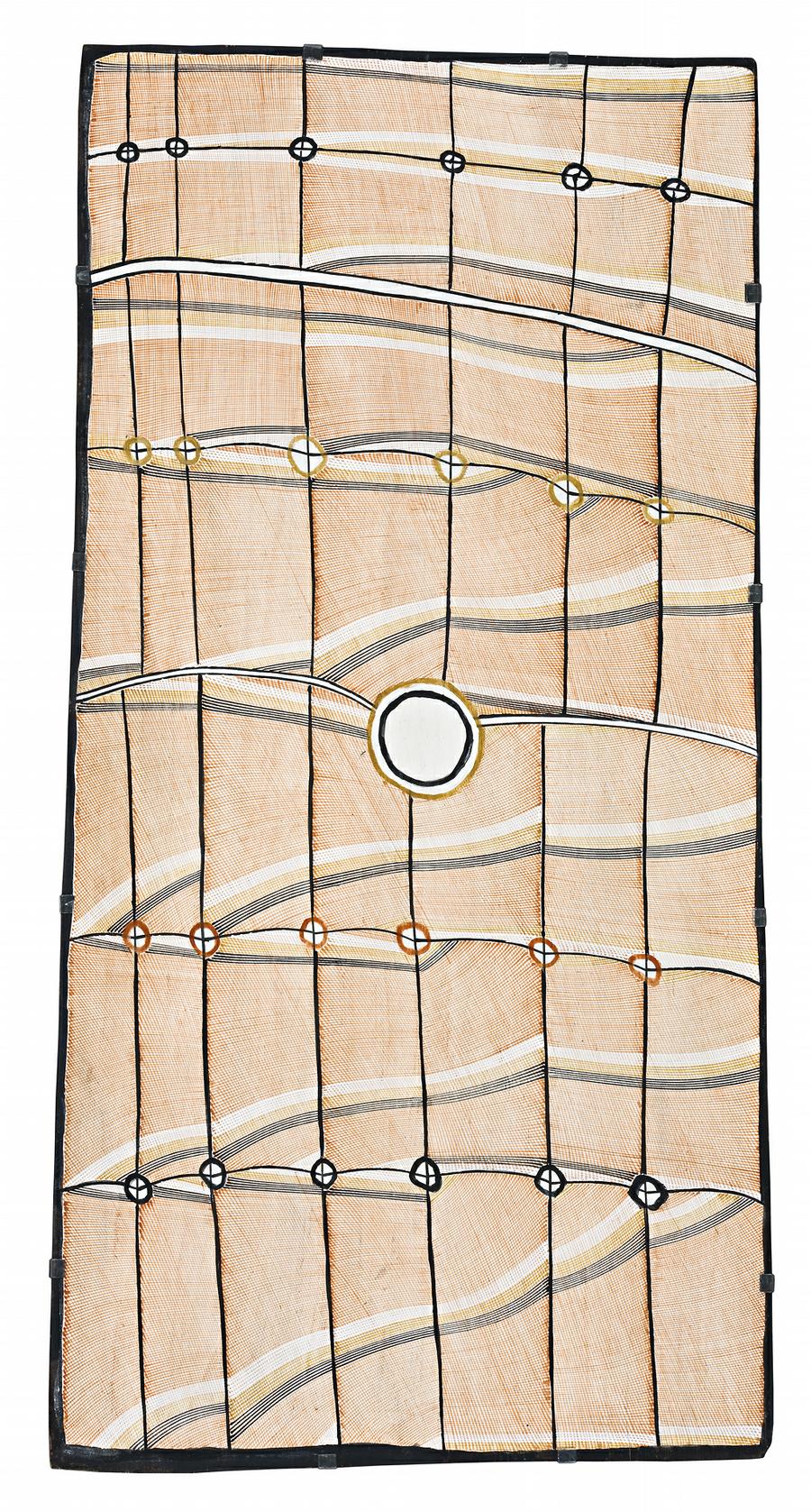 This painting is accompanied by a certificate of authenticity from Maningrida Arts and Culture, Northern Territory, which states in part: 'John Mawurndjul has depicted the billabong at Milmilngkan where Ngalyod - the rainbow serpent - resides under the water. Kuninjku people say there are two Rainbow serpents. One is said to have been the original creator of all ancestral beings, the “first mother”. Yingarna's first born is a Rainbow serpent called Ngalyod. Yingarna - the Rainbow serpent - or her son Ngalyod are common subjects on contemporary Kuninjku bark paintings.