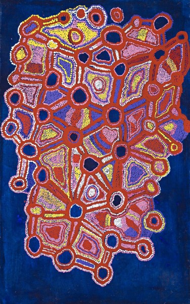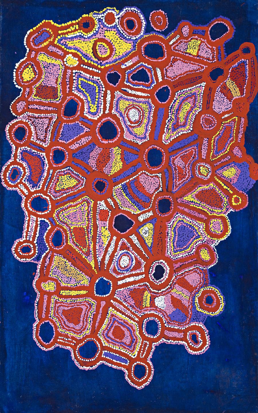 This painting is accompanied by a certificate of authenticity from Neil Murphy Indigenous Art, Sydney, which reads: 'Judith is a senior woman who grew up and had children of her own in the Spinifex area. This painting is centred on Ngorln and features the major rockholes of Mingga, Yawarta, Mirrutjara, Miwaltjara, Yawarr, Tjunkaltjara, Tjintalkara and Nintjibitti. Judith has painted this area around her birthplace as a Minyma Tjuta (Seven Sisters) story because the women's side of this vast Spinifex story is especially significant within Judith's country. Other major Spinifex stories are present through this country also although they are not made overt in this painting.'