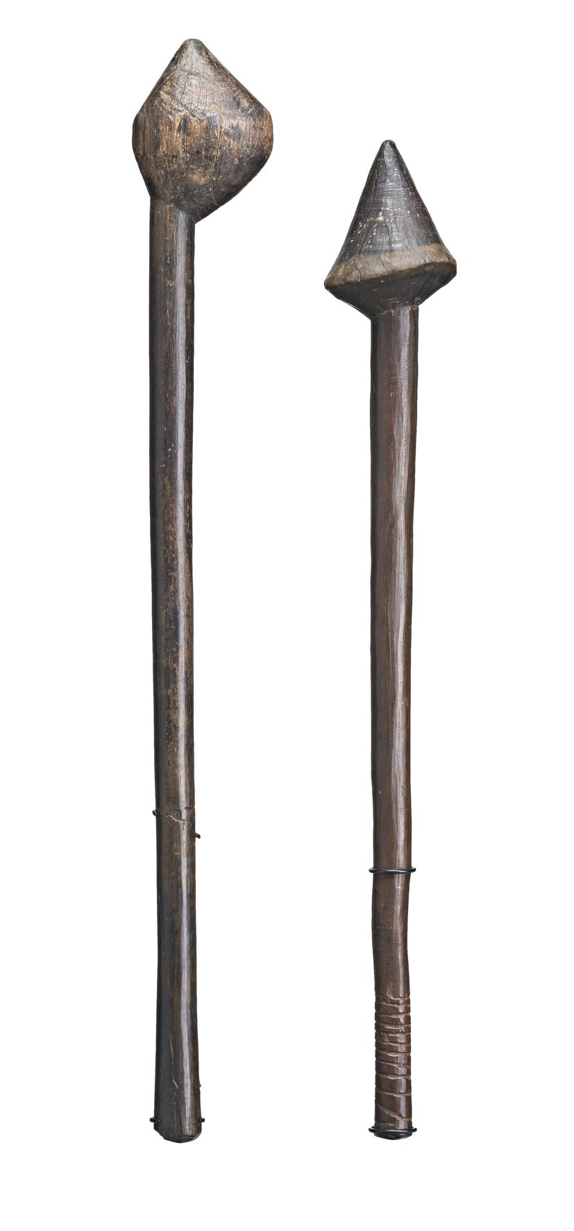 carved in hardwood, the first with bi-conial striking section and shaft of circular section with several circular incisions to the grip, the second example from the Darling River region, with offset striking section and undecorated shaft, both with old dark shiny patina