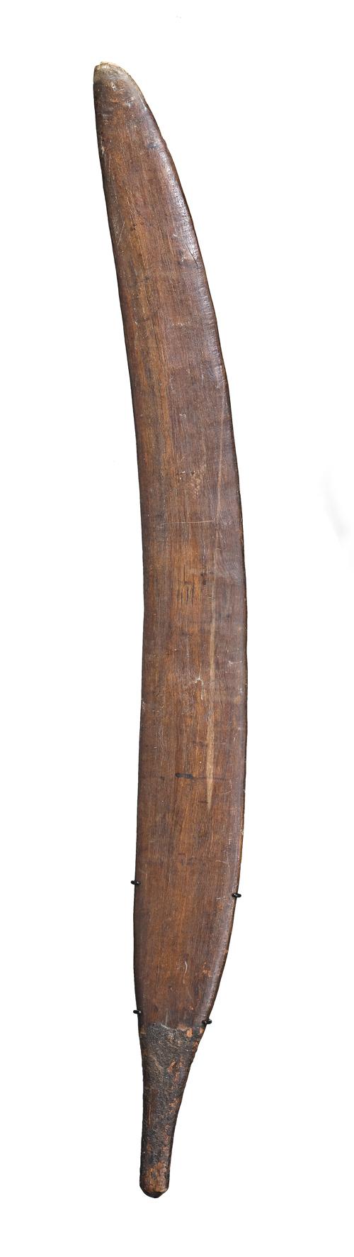 of leaf like form tapering to a handle encrusted with black resin on the grip
