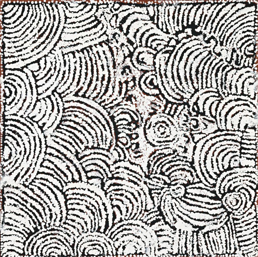 This painting is accompanied by a certificate of authenticity from Papunya Tula Artists, Alice Springs, which reads: 'This painting depicts designs associated with the Seven Sisters Dreaming at Dale Creek near Warakuna. The roundels represent camp sites and the “U” shapes are women who are being pursued by a man.'