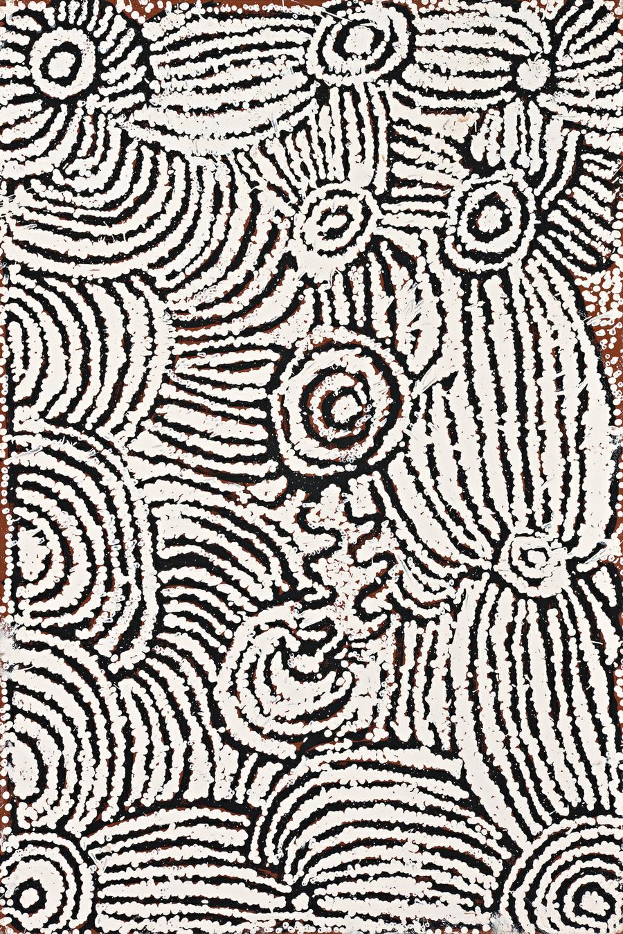 This painting is accompanied by a certificate of authenticity from Papunya Tula Artists, Alice Springs, which reads: 'This painting depicts the rockhole site at Dale Creek. The roundels represent rockholes and the artist has shown two venomous snakes coming out of one of the rockholes. A group of women camped at the site gathering edible berries and seeds growing in the area.'