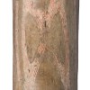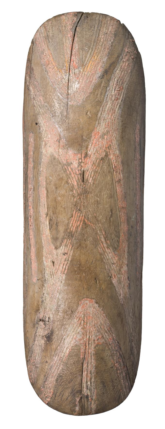 of elongated ovoid form the bulbous front decorated with incised traditional designs with traces of red and white natural pigments, the reverse with deep cut lug handle decorated with three finely incised vertical bands in-filled with red pigment