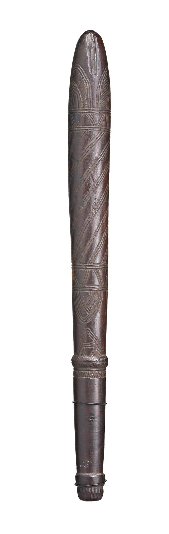 carved in hardwood of circular section in the shape of a truncheon, decorated with incised angular lines wrapping the shaft, articulated handle