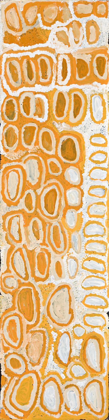 This painting is accompanied by a certificate of authenticity from Papunya Tula Artists, Alice Springs, which reads in part: 'This painting depicts designs associated with the travels of the Kungka Kutjarra (Two Women) to a site on the south side of Lake MacDonald. The two women were digging for the small animal Kuningka (Western Quoll). The women later continued their travels to the east.'