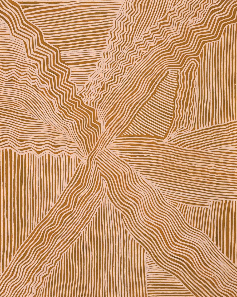 This painting is accompanied by a certificate of authenticity from Papunya Tula Artists, Alice Springs, which reads in part: 'This painting depicts designs associated with Yaltintja, soakage site, north west of Jupiter Well. In mythological times a large group of Tingari Men camped at this site with young boys before travelling to Lake Mackay. The painting depicts the collision of the Lightning and Snake Dreamings, whereby they joined up and followed the group instructing the young boys along the way.'
