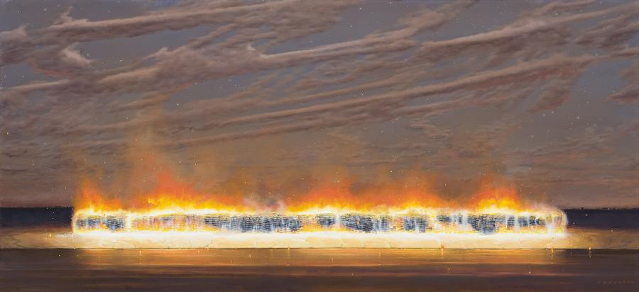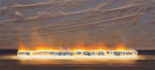 Like the finest of Storrier's work, The Waterline (Smokey Dusk) encapsulates the artist's enduring interest in the four elements and the power of life which they embody. In the manner of the great Romantic painters of the nineteenth century such as JMW Turner and Casper David Friedrich, Storrier here contemplates the insignificance of humankind when compared to the awesome magnitude of the natural world, drawing upon the symbolism of the fading light of day as a metaphor for change or the fin de siècle, end of an era. Unifying fire with an entirely different great vastness (untraversed bodies of water and infinite celestial skies), thus the present work may be construed as bearing allusions to evolution, the passing of time and the grandeur of decay in the same vein as the traditional vanitas still life. As Storrier himself muses, '...there is a relationship between fecundity and mortality, between something that is wet and something that is burning. These are primal poetic qualities that do not change in terms of the human spirit.'2