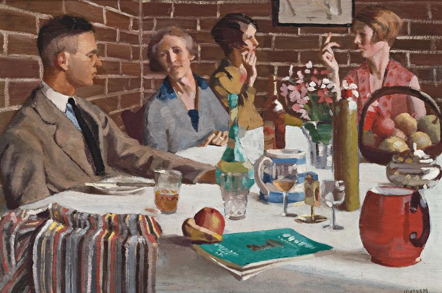 Al Fresco 1927 is a rare and significant example of one of Herbert Badham's earliest works. Having completed his studies at the Sydney Art School the year before, he exhibited Al Fresco in his first year with the Society of Artists. Moreover, years later it was catalogue number one in the definitive retrospective Badham exhibition shown at the Wollongong City Gallery and S. H. Ervin Gallery, Sydney in 1987. Painted shortly after Badham's marriage to Enid Wilson, Al Fresco presents a typically informal family glimpse into their unit at Vaucluse. His wife is joined at table (left to right) by her brother Reg, mother, and sister Mrs Crockett. As a family group portrait, it shows his early accomplishments in portraiture as well as his considerable compositional abilities, especially his inventive use of perspective. Badham not only exhibited a number of times in the Archibald Prize, but he was also runner-up to William Dobell in the 1932 New South Wales Travelling Art Scholarship. His self-portraits are among his finest, examples from 1935, 1936 and circa 1939 being in the New England Regional Art Museum (Howard Hinton Collection).