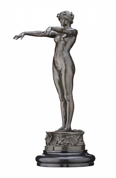 Mackennal's Circe brought him fame and unexpected notoriety. The original lifesized plaster was modelled in Paris and exhibited in the Salon of the Socéité des Artistes Français (Old Salon) in 1893. Given a place of prominence, it was awarded an honourable mention and received very good press reviews. The art critic for the Revue des Deux Mondes wrote most favourably - 'The tense, restrained, but triumphant beauty of the sorceress bears itself with a firm and elegant alertness which is free from all trace of vulgarity and all suggestion of the model...'1 R. Jope Slade, writing in the August 1895 issue of the London Magazine of Art, described the work as 'stamped with a remarkable and distinctive individuality.'2 While likewise admired when exhibited at the London Royal Academy of 1894, the activities of the high relief figures around the base caused anxiety 'not being', as Hanging Committee described them 'in accordance with the exigencies of the exhibition'.3 Their actions were those of swine debased through Circe's magic potion. Although the sculpture was given a 'place of honour', the based remained covered from public view by 'a swathing of red baize.'4 The life-sized sculpture was cast in bronze in Paris in 1901, nowadays casting her spell over all who venture near her in Melbourne's National Gallery of Victoria. Her popularity led Mackennal to produce an edition of statuettes in about 1902-04.