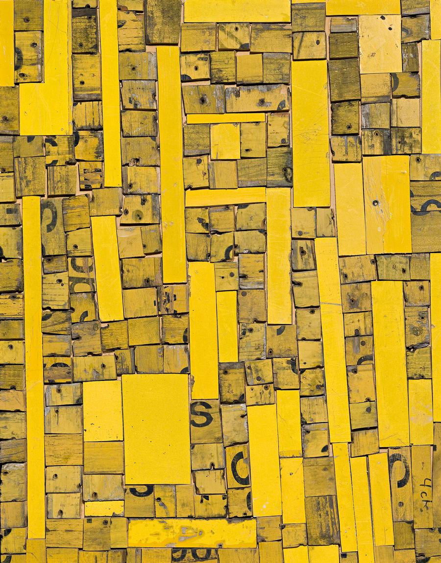 Like the best of her work, Gold Rush does not symbolise the landscape but rather 'represents' it, each fragment of road sign or wood evoking memories and associations particular to the individual viewer. Having eschewed the use of iconography, Gascoigne thus transforms text into texture - a wordplay of which she is no doubt aware - to suggest a powerful sense of landscape and light. With their rhythmic pattern composed of words, such works have not surprisingly been described as 'stammering concrete poems'2 - a perceptive analogy, especially given the artist's predilection for poetry from Shakespeare to Plath. Notwithstanding, Gascoigne stresses that the flickering word fragments, though carefully arranged, are not intended to be read literally: 'Placement of letters is important, but it's not a matter of reading the text - it's a matter of getting a visually pleasing result.'3