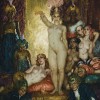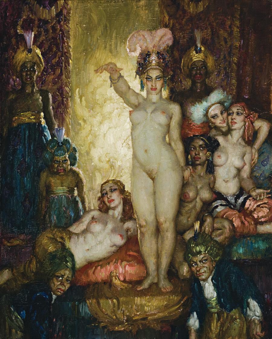 The link to witchcraft in the title, the calling up of the magical spell to bewitch, is given form through alluring flesh, pose and gesture. Commanding in her triumphant frontalism and powerful look, her eyes bore directly and hypnotically into those of the viewer. Interestingly, the gesture of her right arm and hand in particular, and the pose in general bare a similarity to that of Bertram Mackennal's once highly controversial bronze Circe of 1893. This is no accident, for Paris in the late nineteenth century was under the spell of Symbolism and its fascination with the femme fatale found in the works of Oscar Wilde, the performances of Sarah Bernhardt, and the paintings of Gustave Moreau and Rupert Bunny. Circe was the witch-love-goddess without equal of ancient Greek times, turning Ulysses' men into swine and then ensnaring in her arms the Greek super hero for a year of amour. Lindsay's lady also speaks of Venus the love goddess of classical Rome, plumed in splendour. Dramatically lit from behind, Lindsay presents all with great theatrical effect, the surrounding beauties, turbaned attendants of guardian Nubian slaves and gnomes all observing with fixed attention the effect of her wizardry. In Lindsay's world of art women are supreme through their ability to enslave the mere male.