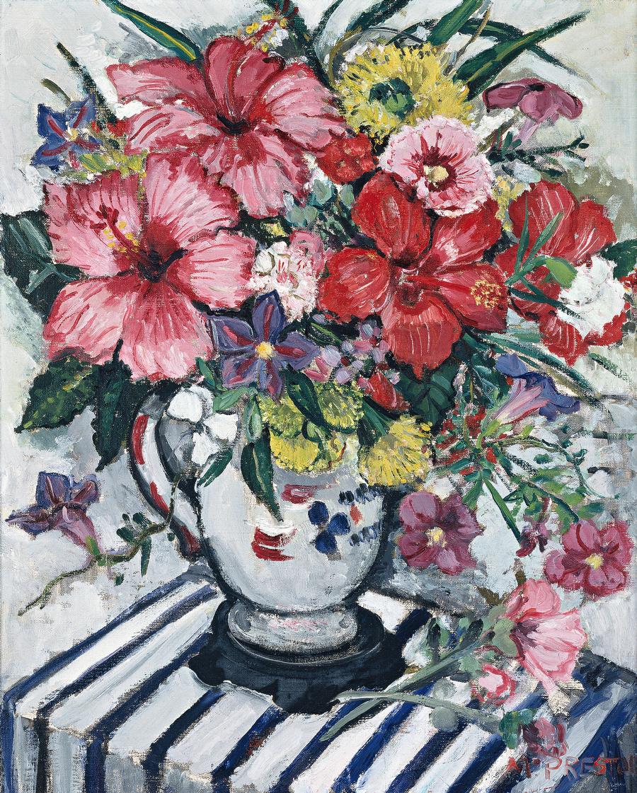 Mixed Flowers is a characteristic painting from this period, employing strong, vibrant colours in the depiction of the flowers, their free flowing shapes offsetting perfectly the striped lines of the table cloth. The interaction and contrast between the two gives the painting its special dynamism, extended through the use of her characteristic compositional device of the high viewpoint. This increases the tension between the illusion of depth, created by the receding lines and angles of the table, and the emphasis on the picture's painterly rich surface of flowers. Through such means Preston's gives added power and directness to her visual statement, immediately engaging the viewer in its creative strengths and sensitivities.