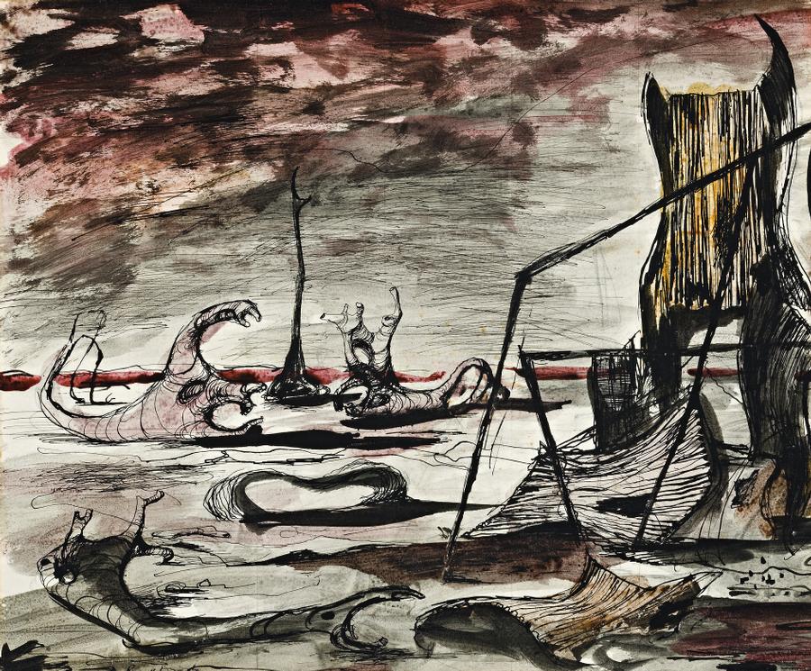 The pen and ink drawing, Study for the Drought Series 1945, has links with all these paintings, the frozen contortions of the dead trees inspired by the British sculptor Henry Moore's inventive forms and harmonious voids. Nature and the man made are harmonised in their shared demise and echoing forms, heroic in their stillness of life. In mythological terms, it is the setting of an epic struggle where only mute monuments to the legendary heroes remain. The Bosch-like uprooted trees and twisted corrugated iron of the fallen building lead into another important drawing in this series, Study for Deserted Out-Station 1945. Both drawings possess that vitality which comes from first-hand experience. The latter drawing was squared up and translated into paint - Deserted Outstation 1945 in the collection of John Fairfax Holdings Limited, an outstanding work among masterpieces. These drawings and paintings are part of that compassionate and humanist vision that is unique to Russell Drysdale.