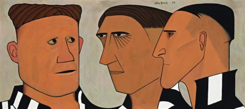 Three of the Players hung in Boyd's Walsh Street South Yarra home for over forty years. It must have appealed to Boyd on several levels not least being its perfect blend of acuteness of perception and sharpness of execution, all enlivened by Brack's singular wit. Three of the Players, all short back and sides, considers the serious matter of football, Melbourne's everlasting passion epitomised by the devotion to, if not fanaticism of, the Collingwood Football Club. In 1953 Collingwood broke its seventeen-year drought and won the Premiership the month before Brack's exhibition opened. Seeking verities beyond the everyday suburban fringe, Brack wittily likens the three Collingwood football personalities in their black and white striped jumpers to three types of players as present in the ages of man. The bulk of youth looks observantly to the older player, eye-lined with experience, while dogged determination is captured in the maturity of the manly profile. The up close focus emphasises their physical presence. The unspoken word is 'The Club', represented by the triumvirate of the past, present and future. Like so much of Brack's work, it shows an engaged detachment about what the human race is up to, contrasting passionate social behaviour with cool presentation.
