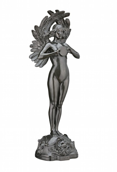 The human figure has had countless roles in art, its expressive potential being greater when depicted nude. Not only is it of supreme beauty in itself, it is also capable of undergoing the most subtle adaptations to express ideas lyrical or sublime, and quite the opposite. Frequently engaged as a metaphor, the female form, for example, has been painted and sculpted to represent everything from spring to justice, and evil to truth. In choosing the naked female figure for Truth 1894, Bertram Mackennal gave sculptural form to that idiomatic phrase 'the naked truth'. Figuring it as something without concealment, he was continuing a literary tradition that has long personified Truth as a naked woman. There is also the allied tradition summed up in John Keats' Ode on a Grecian Urn - 'Beauty is truth, truth beauty.' While Mackennal may have derived the pose from his sculpture Circe, the wings add an angelic or celestial touch, with the held mirror being a further extension of the idea of truth. It is said a mirror does not lie.