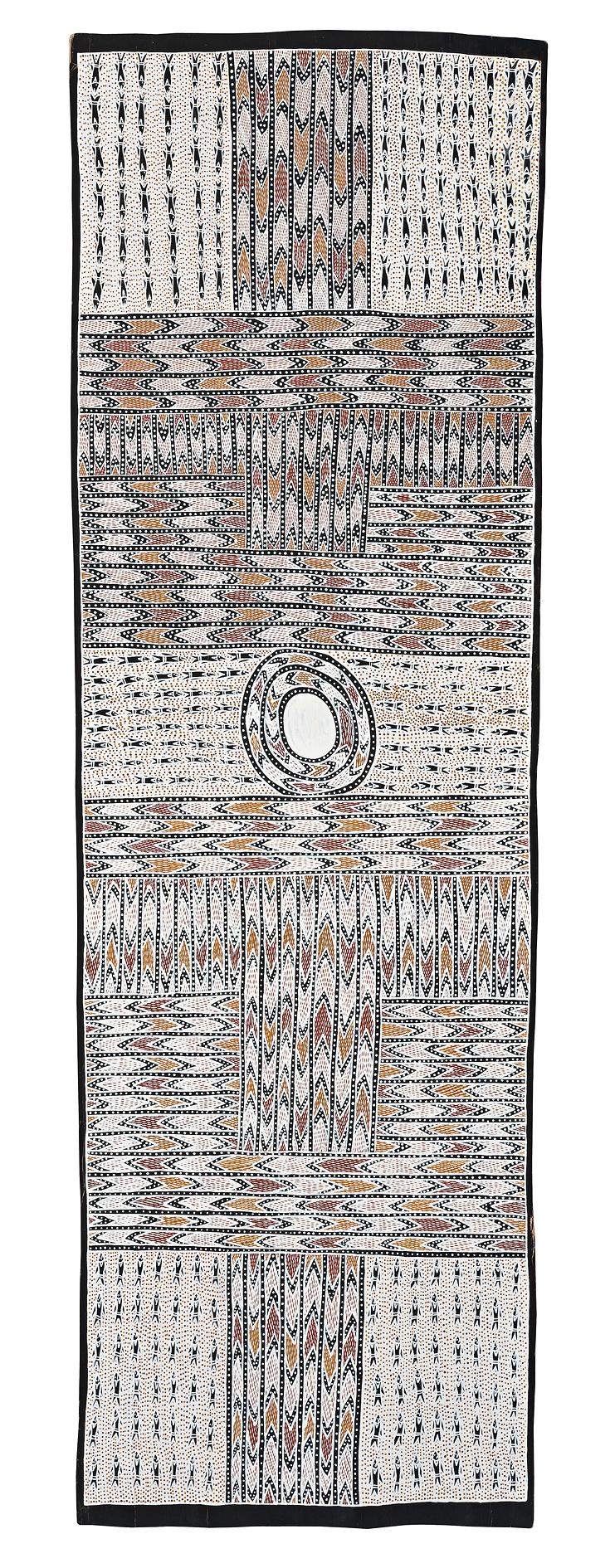 This work is accompanied by a certificate of authenticity from Buku–Larrngay Mulka Arts which states: 'The central icon is a massive rock which stands at the entrance of Gurka'wuy (Trail Bay). This is the spiritual focus for an alliance of clans who share an identity connected with the felling of the Stringybark tree by (the) ancestral being Wuyal. These groups dance songs of honey flowing like rivers of freshwater from the fonts deep in the saltwater under in the rock in groups like schools of mullet who themselves mill around the rock. The rivers belonging to these clans: the Marrakulu, Golumala, Marrangu and Wawilak flow (metaphorically, spiritually and underground) towards this rock from Gurka'wuy, Barkirra, Raymangirr and Njilibitji respectively.