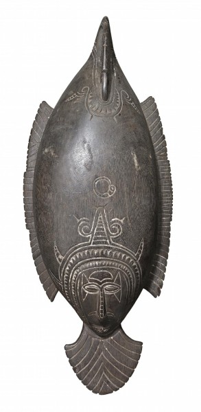 1940s carved and incised hardwood with traces of pigment, with carved decorated handles in the form of the tail and head of a bird devouring a fish, the base decorated with a design of a human head adorned with a decorative headdress