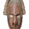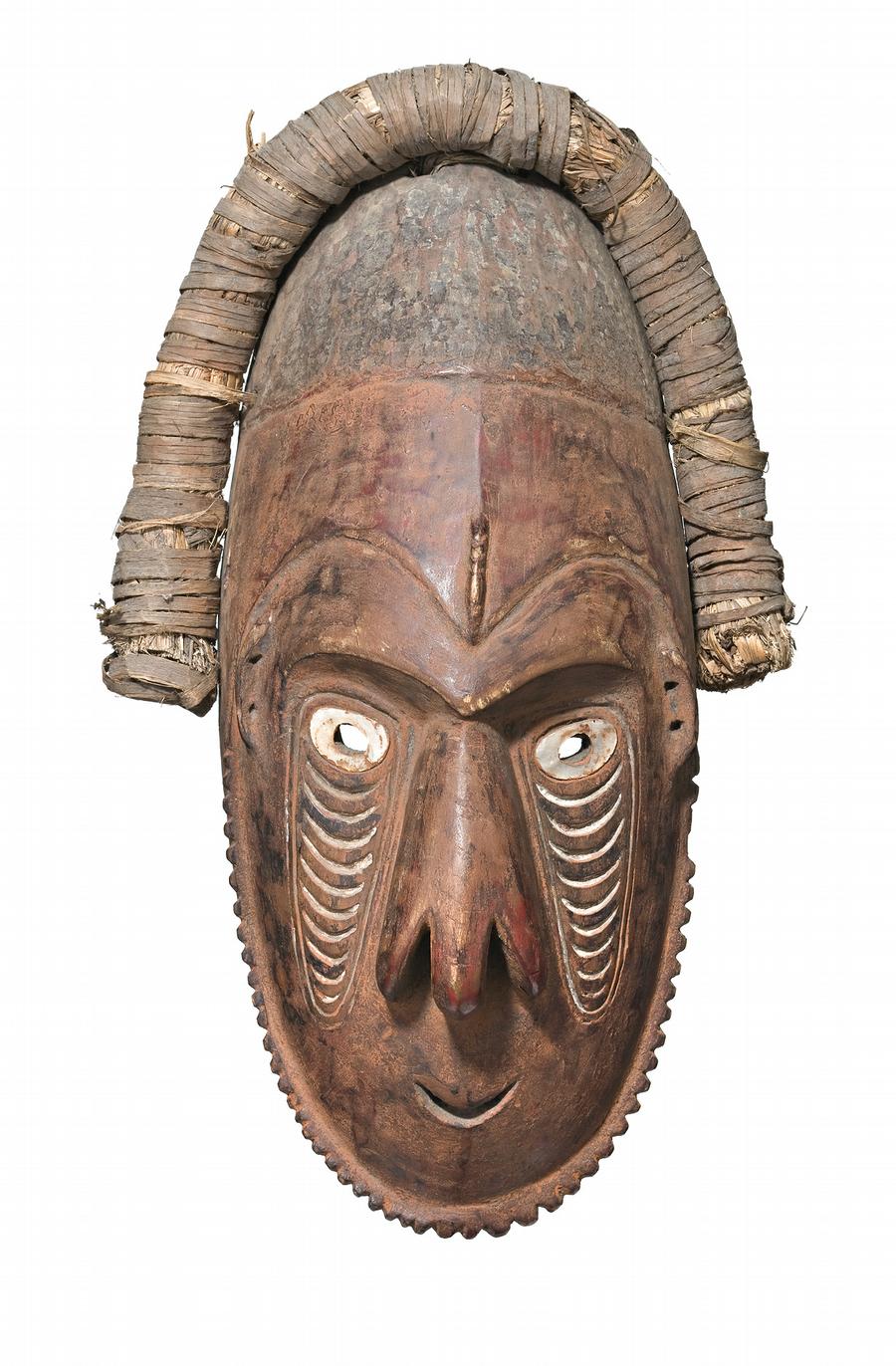 1950s—60s carved and incised hardwood with traces of red and white pigment, pearl shell and a coiled natural fibre headdress