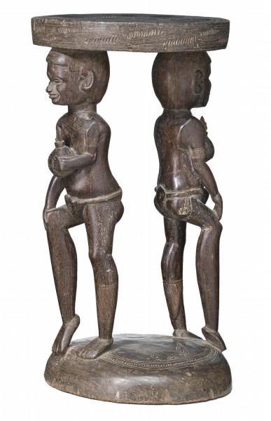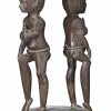 1950s—60s carved and incised hardwood with old patina, in the form of two human figures each holding a drinking vessel, the top and sides with traditional designs