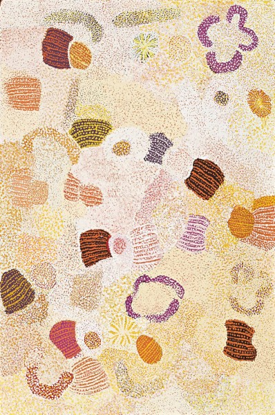 Pawalla shows the abundance of Nyumi's country, the painting dense with luminous symbols representing traditional bush foods such as kantjilyi (bush raisin), pura (bush tomato), and minyili (seed). Women are represented as U shapes, with their wana (digging sticks) and coolamons. The many dominating white layers are referred to as kintikinti (close–close) which creates a rich texture that references the seeds of spinifex which grow abundantly after the rains.
