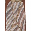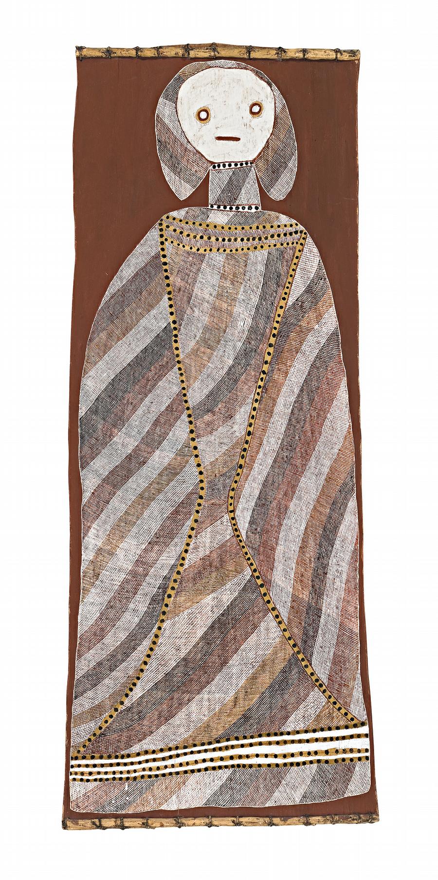 Yingarna is described by the Kunwinijku as the original creator being, a powerful ancestral being of androgynous form who held all the original ancestors or dreaming inside her body until she was speared to let them out. This work probably shows a myth described by Senior Curator Judith Ryan in her publication Spirit in land: bark paintings from Arnhem Land in the National Gallery of Victoria, as ‘an incident in the Ancestral period when “Yingarna” was floating down the East Alligator River in a fish–trap, creating and naming animals, plants and sacred sites and giving land to people as she travelled. “Yingarna” seems to emerge from the fish–trap, which is decorated with rarrk so that it resembles a sacred object.'