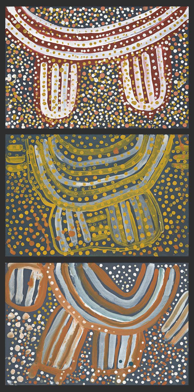 Portraying the decoration applied to the neck, breasts and shoulders of Anmatyerre women, these three panels were painted in the first year of the artist's production. They reveal the ancestry of her subject matter and a masterly control of paint. Conversely the variegated infill dotting on each panel is a precursor of what is to come when the components of Kngwarreye's iconography, the lines and dots, become honed into a more abstract and minimal expression.