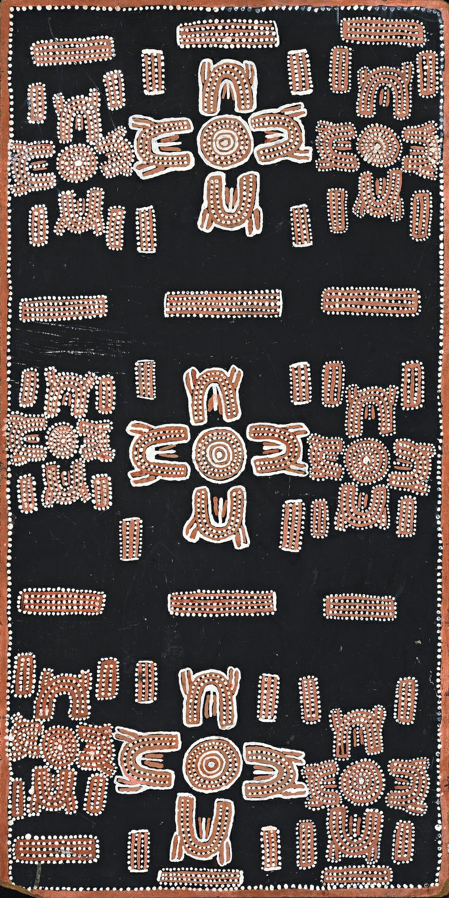 The subject matter of this painting is that of a boy's initiation story. Between the period 1971 and the artist's passing, only four records exist in the Papunya Tula archives of works relating to this subject.2 Notable in the artist's style is the regular repetition of the motif for a squatting boy, distinguished by adding barbs or horns to the traditional ‘U' form. Grouped into sets of four, the initiates await the upcoming ordeal.